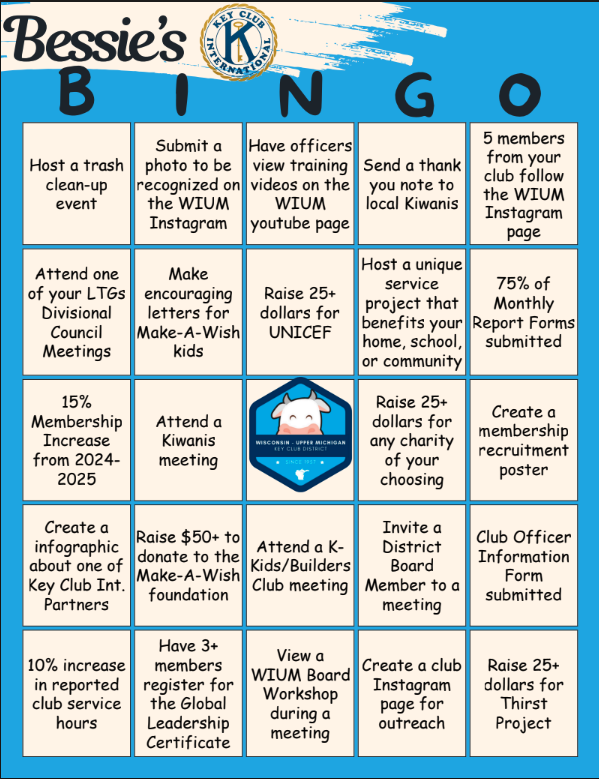 This year, the District Board is excited to announce our new challenge, Bessie’s Bingo! Clubs should work to complete this bingo card for the opportunity to win some great prizes at DCON 2026. Click on the bingo card to be directed to a PDF version. For rules and more information, visit HERE.